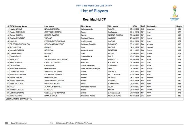 腾讯体育讯 北京时间11月30日,FIFA官方公布了世俱杯各大参赛队大名单,引人瞩目的欧冠冠军皇家马德里大名单,为了给门将位置留出一个名额,齐祖未将一线队中卫巴列霍置于名单中。