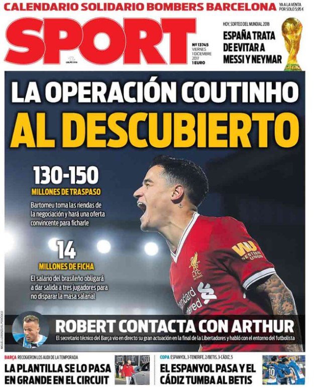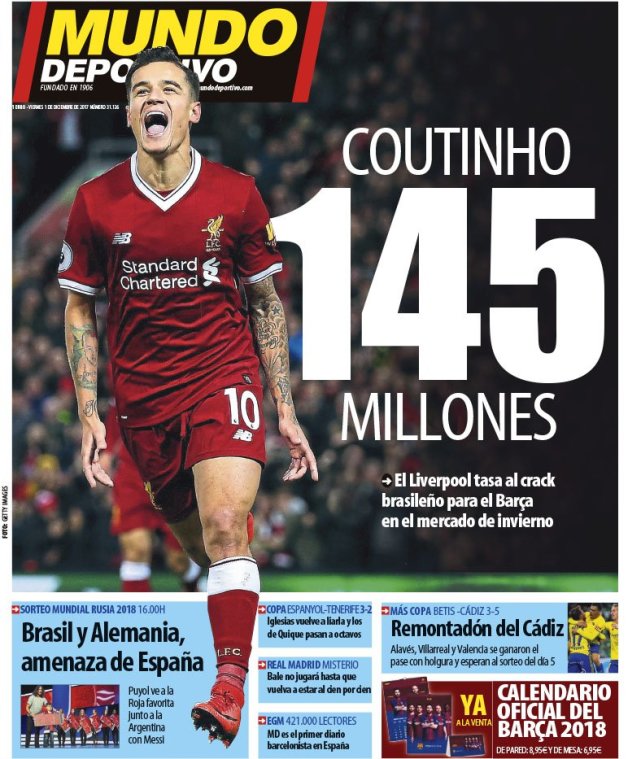 《世界体育报》在今天的封面指出,利物浦对于库蒂尼奥的要价达到了1.45亿欧元,相比之前的1.5亿欧要价,已经下降了500万欧元。《每日体育报》今天的封面同样聚焦库蒂尼奥和巴萨的转会问题。这家西媒透露,巴萨主席巴托梅乌将亲自介入这笔转会,希望顺利引进实力不俗的巴西人。