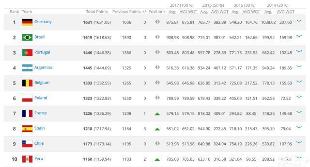 具体而言,西班牙队、英格兰队就吃了亏,在FIFA计分的“最后一年”,2016年11月15日和2017年11月9日之间,西班牙、英格兰仍然积极的参加热身赛,而且热身赛用于练兵试阵,战绩远远逊于同期内的正式比赛。这导致他们比赛打的越多,计分反而越低——毕竟一场友谊赛输球0分,会拉低正式比赛取胜赚取积分的效果,毕竟是取平均分的机制。