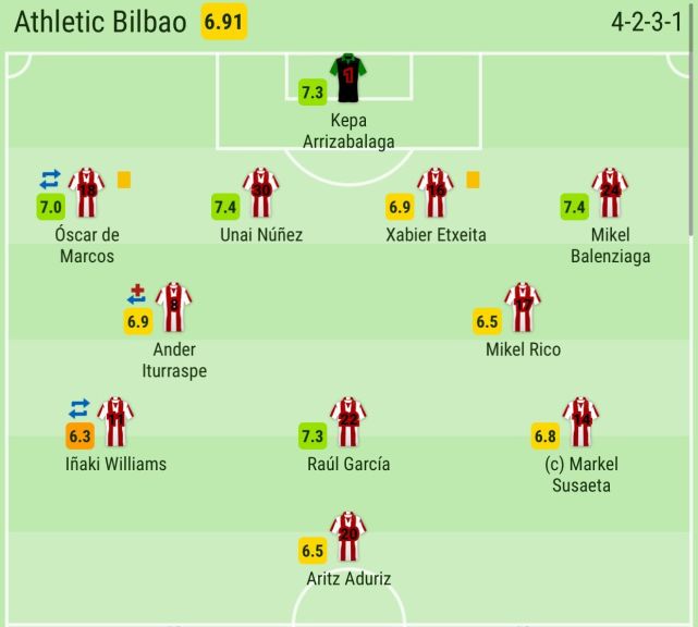 毕尔巴鄂竞技首发:1-凯帕,16-埃切塔,18-德马科斯(72’15-莱奎),24-巴伦西亚加,30-努涅斯,8-伊图拉斯佩(39’6-圣何塞),14-苏塞塔,17-里科,22-劳尔-加西亚,11-伊尼亚基-威廉姆斯(82’28-科尔多巴),20-阿杜里斯