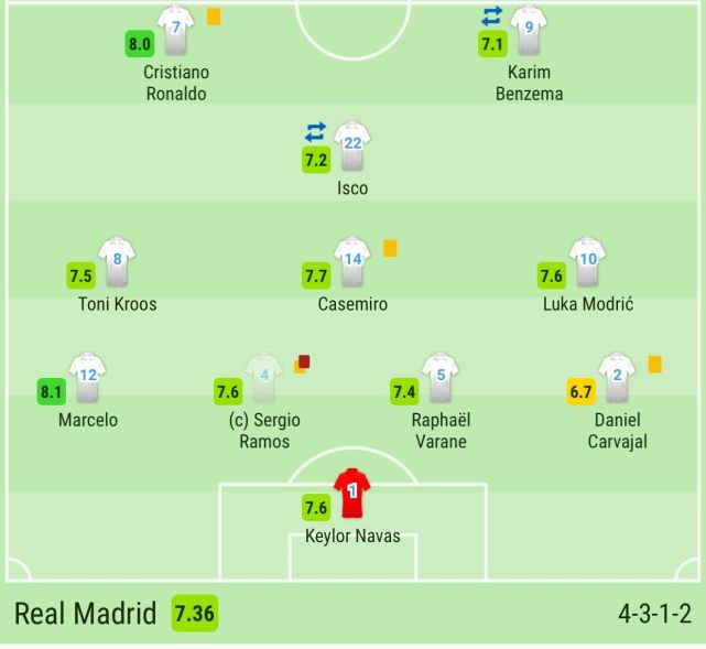 皇家马德里首发:1-纳瓦斯,2-卡瓦哈尔,5-瓦拉内,4-拉莫斯,12-马塞洛,10-莫德里奇,14-卡塞米罗,8-克罗斯,22-伊斯科(82’23-科瓦契奇),7-C罗,9-本泽马(82’21-马约拉尔)