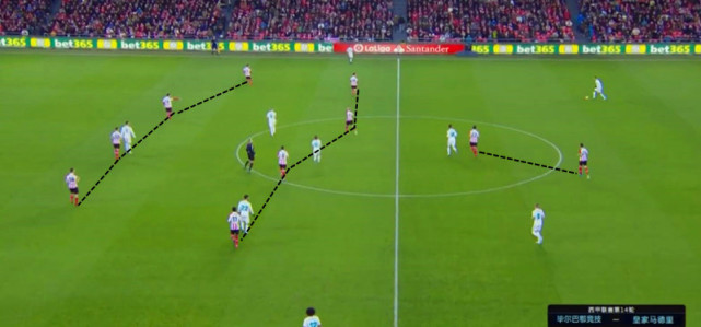 毕尔巴鄂竞技官方站位是4-2-3-1,但在阵地防守时两边的威廉姆斯和苏塞塔要收到中场协助双后腰伊图拉斯佩和里科,四人呈平行站位。而劳尔加西亚和阿杜里斯在前场展开逼抢,从拉莫斯多次犯规以及最后红牌下场来看,毕尔巴鄂竞技达到了“骚扰+限制为主,反击为辅”的目的。