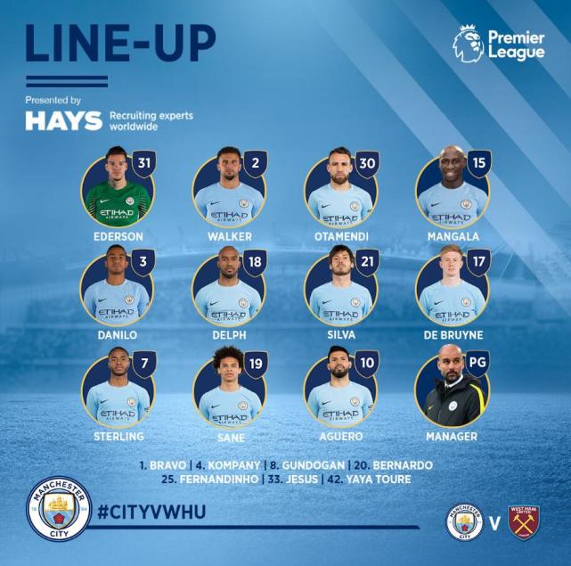 替补:1-布拉沃、42-亚亚-图雷、8-京多安、25-费尔南迪尼奥、20-伯纳多-席尔瓦、33-热苏斯、4-孔帕尼