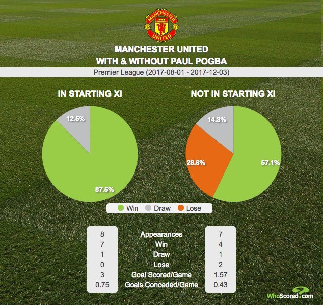 腾讯体育讯 北京时间12月4日,本周末的英超赛场将上演曼彻斯特德比,这场比赛的重要性毋庸置疑,可能影响红魔的联赛走势。对于穆里尼奥来说,非常遗憾的一点是,在对阵阿森纳一战吃到红牌的博格巴将缺席这场重磅较量。按照whoscored网站的数据,没有了博格巴,曼联的战绩可是会受到相当大的影响。