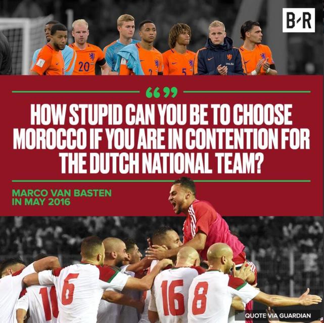 一年前,当时还是荷兰国家队助教的范-巴斯滕对齐耶赫选择为摩洛哥出战的决定抨击道:“你明明有机会为荷兰队效力,你究竟是有多蠢才会选择摩洛哥?”