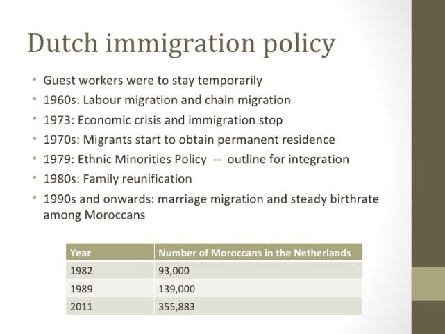 到了1980年,绝大多数人已经认可荷兰一个移民国家。这导致了荷兰政府决定实行所谓的少数民族政策。政府意识到,如果客籍工人和家属想留在国内,就必须在社会上占有一席之地。当时荷兰的经济形势并不乐观,许多以前的客籍工人,特别是那些有摩洛哥或土耳其背景的,已经失去了工作。这些非西方移民通常没有什么工作上的资历,很多人沉默寡言,也不会讲荷兰语。所以为了支持和赋权于不同族裔社区,让他们尽早融入荷兰社会,荷兰政府组织了一些免费的语言教育和职业方案规划的课程。
