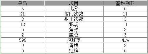 皇马半场5-0,今年1月后首次主场半场打入5球。塞维利亚上次西甲半场丢5球,还是1987年1-5落后萨拉戈萨。