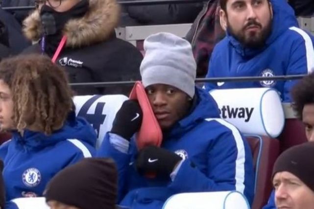 客场对阵西汉姆联,切尔西主教练孔蒂采用了352阵型。在中锋的位置上,他选择了莫拉塔,巴舒亚伊只能坐在看台上静候比赛机会。比赛进行到第31分钟,转播镜头捕捉到了场边一个有趣的细节。看台上的切尔西球员都在密切的关注比赛进展,唯独巴舒亚伊有点例外,头上戴着灰色绒线帽子,手上戴着黑色手套,还不忘找到一个粉红色的热水袋,捂着脸颊取暖。