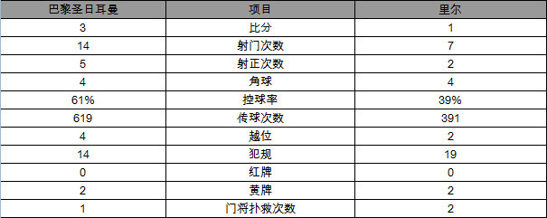 全场比赛,巴黎圣日耳曼然14次攻门5次射正打入3球,里尔7次攻门2次射正收获1球。巴黎的控球率达到61%,里尔则为39%。