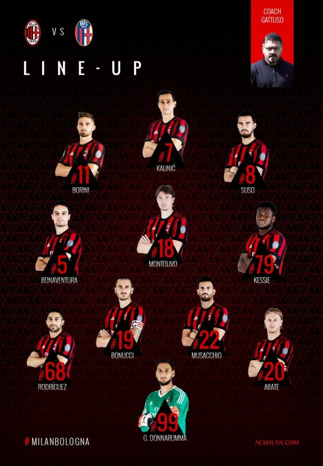 AC米兰(4-3-3):99-唐纳鲁马/20-阿巴特、22-穆萨基奥、19-博努奇、68-里卡多-罗德里格斯/79-凯西、18-蒙托利沃、5-博纳文图拉/8-苏索、7-卡利尼奇、11-博里尼