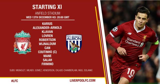 腾讯体育讯 北京时间12月14日凌晨4点,2017-18赛季英超第17轮,利物浦坐镇安菲尔德球场迎战西布朗,双方首发阵容已经公布。