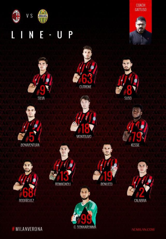 AC米兰(4-3-3):唐纳鲁马/卡拉布里亚、博努奇、罗马尼奥利、里卡多-罗德里格斯/凯西、蒙托利沃、博纳文图拉/苏索、安德烈-席尔瓦、库特罗内
