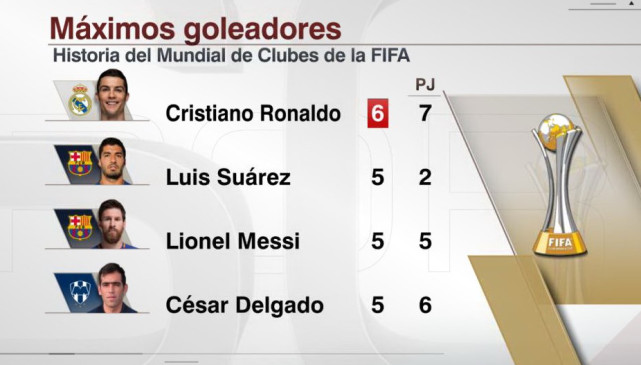 C罗世俱杯生涯已斩获6球,2008年效力曼联时半决赛打入1球,去年半决赛是其时隔8年首度在这项赛事破门,随后决赛上演帽子戏法,助皇马4-2经历加时赛逆转鹿岛鹿角捧杯。C罗就此成为世俱杯史上独一无二的最佳射手,7战6球,5战5球的梅西,2战5球的苏亚雷斯以及6战5球的前阿根廷国脚塞萨尔-德尔加多,并列历史第2,之后是斩获4球的德尼尔森与非洲名将阿布特里卡。