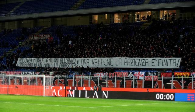 米兰球迷被彻底激怒了。本战圣西罗南看台飘荡着硕大的横幅:“一年600万,还弄来了无用的哥哥,这是道德暴力?滚吧,我们的耐心已被耗尽了!”南看台球迷还在高唱“Gigio vattene”(多纳鲁马滚蛋),或是“Dollarumma”(将多纳鲁马的名字前面改成美元)。