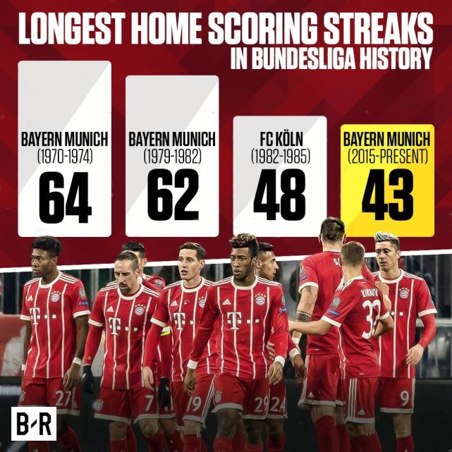在拜仁击败科隆后,这支海因克斯的球队又书写了新的历史,从2015年开始算起,拜仁在连续的43个德甲主场都有破门,这是了不起的成绩,可以排名德甲历史第四。