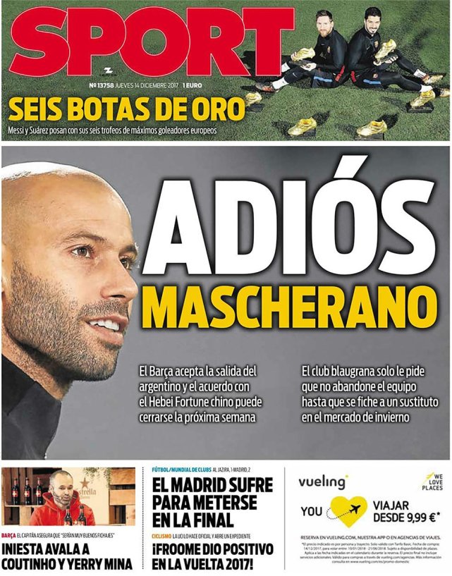 马斯切拉诺在最近一段时间成为了西媒关注的焦点人物,究其原因是他一直在闹离队。一开始,巴萨不希望放他离开,毕竟乌姆蒂蒂受伤休战八周,巴萨在中后卫位置上的人员捉襟见肘。不过最近一段时间,比利时后卫维尔马伦的发挥非常不错,而巴萨也即将在1月份引进哥伦比亚后卫米纳,因此,巴萨高层才考虑让阿根廷国脚离开。《每日体育报》甚至在封面上打出了“再见,马斯切拉诺”的标题。