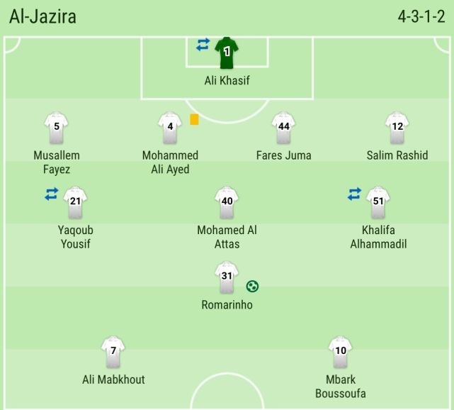 阿布扎比半岛首发:1-阿里-哈赛夫(51'36-哈利德-塞纳尼)、12-萨勒姆-奥贝德、44-法里斯-朱马、4-穆罕默德-阿伊德、5-穆萨利姆-法耶兹、51-哈利法-阿尔哈马迪(60'14-伊萨-穆罕默德)、10-布苏法、40-穆罕默德-阿塔斯、21-雅库布-尤瑟夫(72'45-艾哈迈德-拉比亚)、31-罗马里尼奥、7-阿里-马布库特