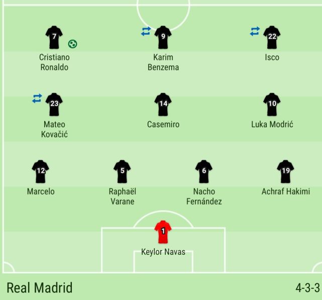 皇家马德里首发:1-纳瓦斯、12-马塞洛、6-纳乔、5-瓦拉内、19-阿什拉夫、23-科瓦契奇(68'17-巴斯克斯)、14-卡塞米罗、10-莫德里奇、22-伊斯科(68'20-阿森西奥)、7-C罗、9-本泽马(81'11-贝尔)
