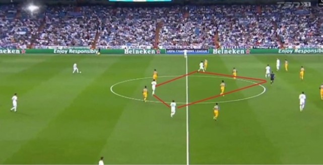 在上一场5-0大胜塞维利亚的比赛中,齐达内排出平行4-4-2的中场站位,莫德里奇和克罗斯搭档双后腰维持球权运转并梳理进攻,阿森西奥和巴斯克斯作为两名边前腰配合边后卫无球套上在边路频繁制造威胁,刚夺得金球奖的C罗状态也十分出色。本场比赛齐达内又恢复菱形中场的配置,并且随着场上优势一边倒的局面,皇马在前场形成了围攻之势。