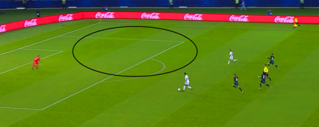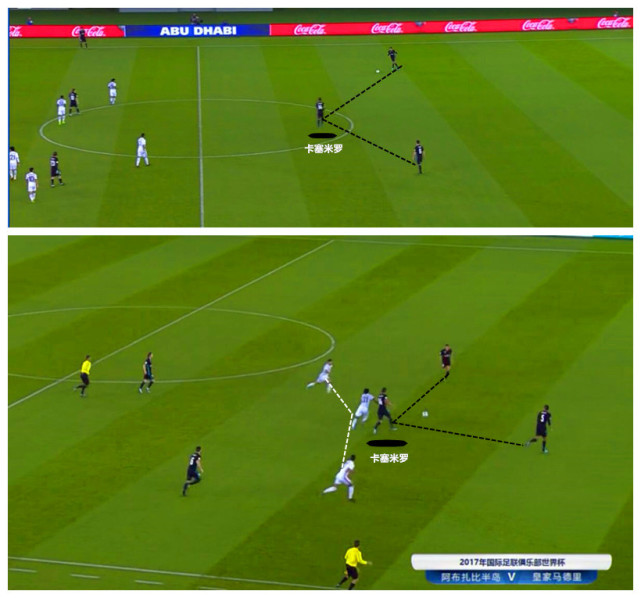 卡塞米罗作为单后腰本身覆盖面积就很有限,加上他往返两个禁区的大量跑动,当皇马被反击时巴西兽腰难以准时回到关键位置参与防守, 只剩下两名中卫。皇马极端的将阵型提前组织进攻,后场开阔的空间让阿布扎比半岛充分利用到。