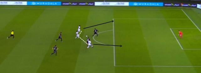 相比莫德里奇的地面渗透,伊斯科作为前场自由人则是频繁在两个边路发动长传寻找双前锋。如图正是伊斯科在右路起球找到本泽马,可惜后着的头球攻门被门将扑出。