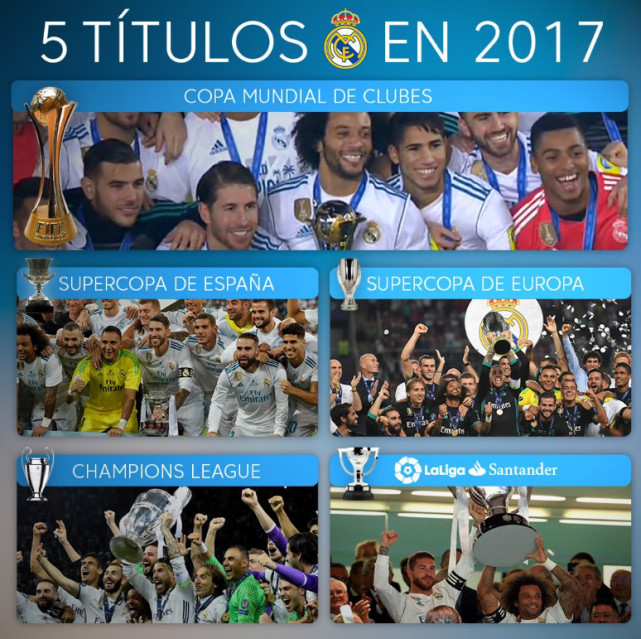 皇马2017年连夺西甲、欧冠、欧洲超级杯、西班牙超级杯与世俱杯冠军,队史上首次同年夺得5冠王。近4个月内,齐达内率队连夺3冠,甚至与巴萨过去19个月内夺冠总数相同。本赛季红蓝军很有希望重夺西甲冠军,但即便如愿问鼎,也很难掩盖皇马最近4年内3夺欧冠的辉煌,以及同期巴萨3次止步欧冠8强的尴尬。