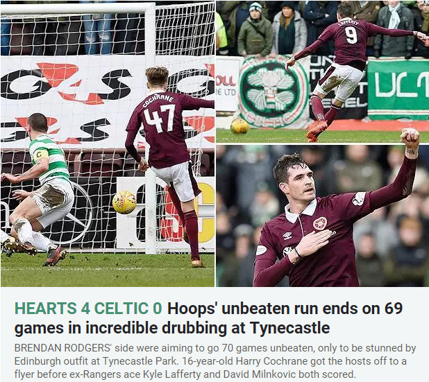腾讯体育讯 北京时间12月17日20:30,在泰因河城堡球场举行了一场2017/18赛季苏格兰超级联赛第19轮的比赛,积分榜领头羊凯尔特人0-4不敌哈茨,前者保持的国内赛事69场不败纪录就此被终结。