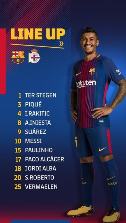 巴塞罗那(4-4-2):特尔施特根;塞尔吉-罗贝托,皮克,维尔马伦,阿尔瓦;拉基蒂奇,保利尼奥,伊涅斯塔;帕科-阿尔卡塞尔,梅西,苏亚雷斯