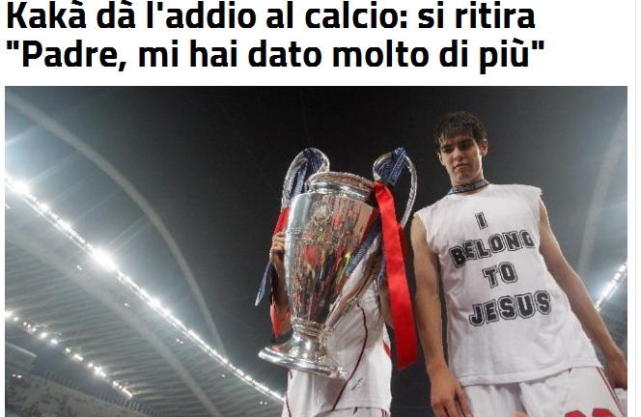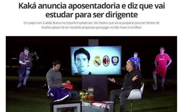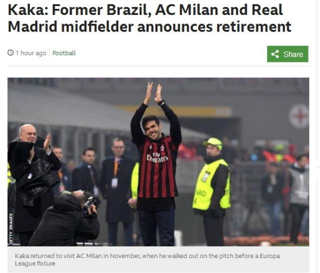 “卡卡告别了绿茵场。这是卡卡周日宣布的,但他也得到了几份继续踢球的邀请。在接受环球电视台采访时,卡卡透露,‘我已经得出了结论,现在到了结束我作为职业球员生涯的时候了。’2007年金球奖得主不会就此离开足球,但并没有透露下一步会干什么。他有可能去圣保罗或AC米兰的管理层。”