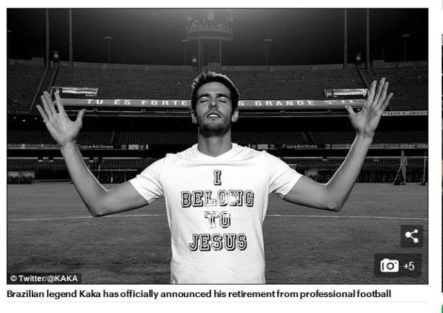 腾讯体育讯 北京时间12月18日,传奇球星卡卡周日宣布退役,世界各大体育媒体都对这位金球奖得主送上了溢美之辞,《每日邮报》更是将卡卡称为“活着的传奇”。