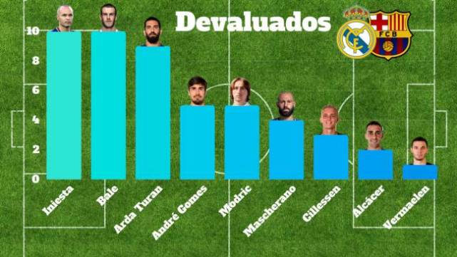 巴萨则有七名球员身价下滑,西莱森的身价从1200万欧元来到900万欧元,马斯切拉诺的身价从1200万欧元下降到800万欧元,维尔马伦的身价从400万欧元下降到300万欧元,安德烈-戈麦斯的身价从3000万欧元来到了2500万欧元,伊涅斯塔的身价从3000万欧元下降到2000万欧元,阿尔达-图兰的身价从2400万欧元下滑到1500万欧元,帕科的身价从2000万欧元下跌到1800万欧元。