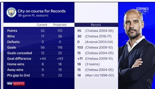 腾讯体育讯 北京时间12月12日,在英超第18轮的联赛中,英超领头羊曼城再次取得了胜利,而在英超18轮之后以52个积分位居英超首位。曼城在本赛季英超十分强势,已经打破了英超连胜的纪录,而据英国媒体《天空体育》统计,从本赛季曼城目前的战绩看,蓝月亮还能追平或者打破九大纪录,而在打破八项纪录中拥有优势。