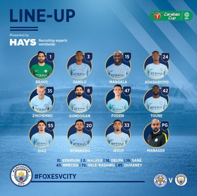 腾讯体育讯 北京时间12月20日凌晨3时45分,2017-18赛季英格兰联赛杯1/4决赛,曼城做客皇权球场挑战莱斯特,双方首发阵容已经公布。