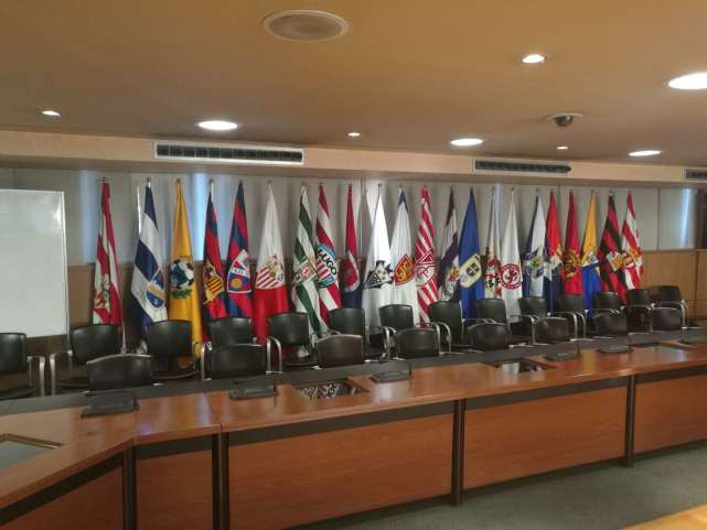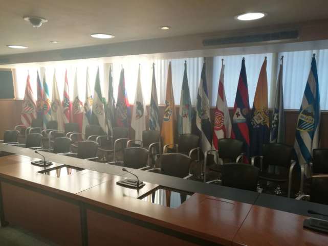 走进西甲联盟的会议厅里,除了中间的logo,两边的旗帜格外显眼,西甲20支球队在右,西乙22支球队在左,西甲和西乙同属西甲联盟,每个赛季结束,会从左边拿出三面旗子移到右边,再重新制作四面放到左边。对于摆放的顺序,负责人透露为避免争议,是按照俱乐部成立时间排列的。在巨大的会议厅里,木质地板和木质柱子显出厚重的感觉,你可以想象一下皇马和巴萨主席同其他俱乐部主席博弈的样子。负责人表示,联盟新址里的多功能会议室更方便、更实用,没有了举办小型会议时需要把椅子摆到大厅中间的尴尬。