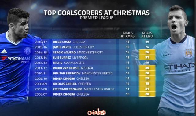 2006-2007赛季的英超,在圣诞节前,切尔西球星德罗巴在英超打入10个进球,也是圣诞节前的最佳射手,而在那个赛季结束后,德罗巴一共打入20个英超进球,也成为了英超的金靴。
