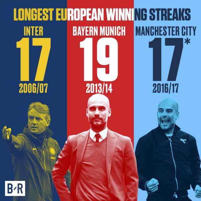 除了超越了皇马、巴萨共同保有的西甲连胜纪录之外,瓜迪奥拉的曼城还追平了意甲豪门国际米兰联赛17连胜的纪录,而该记录的制造者正是前曼城主帅曼奇尼。不过,不同于曼奇尼的胆战心惊的低耗式得分,瓜迪奥拉的曼城以精彩传控下的强悍进攻去寻求胜利。而且,国米当时连胜纪录的创造在一定程度上还得以于“电话门”事件造就的国米一家独大的局面,而在竞争更加激烈的英超赛场,曼城的连胜纪录含金量要更高。