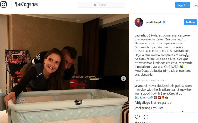 腾讯体育讯 在随巴塞罗那赢得本赛季首场西班牙国家德比大战(西甲联赛)之后,巴西国脚中场保利尼奥通过社交网络与妻子大秀恩爱,高纯度狗粮虐死单身狗无数。