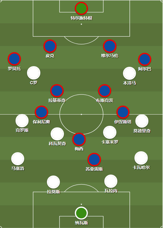 巴萨首发:1-特尔施特根、20-罗贝托(90'22-阿莱士-比达尔)、3-皮克、25-维尔马伦、18-阿尔巴、4-拉基蒂奇、5-布斯克茨、15-保利尼奥(83'21-安德烈-戈麦斯)、8-伊涅斯塔(76'2-塞梅多)、10-梅西、9-苏亚雷斯