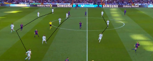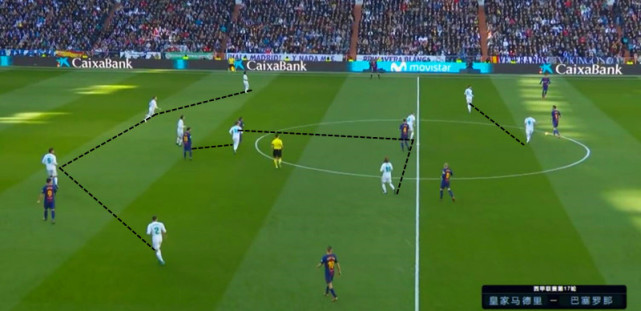 皇马此役在中场由科瓦契奇搭档卡塞米罗,克罗斯和莫德里奇分别在左右两次,双前锋则是C罗和本泽马。在后腰位置增加一名球员协助卡塞米罗,齐达内的用意很明确,这是针对梅西所做的一次针对性调整。