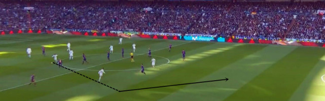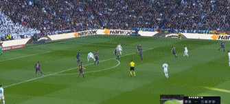 皇马的进攻方式除了在左路形成强侧打击巴萨防守弱侧,莫德里奇也多次直线长传直接找C罗打巴萨身后。虽然C罗大部分的前插都越位在先,但如图中的这一次是绝佳的机会。C罗及时传给中路的本泽马,但后者还是在包夹之下没有将球打进。