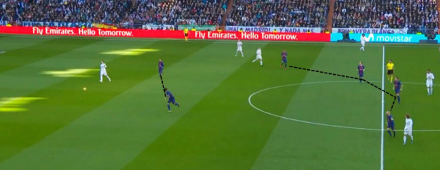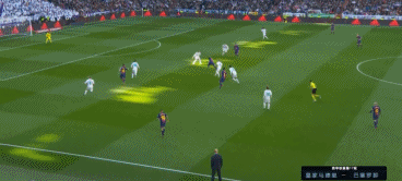 整场科瓦契奇几乎都与梅西保持平行站位,克罗地亚人需要做的不仅是压制梅西的持球空间,还要积极抢断打出反击。如图正是科瓦契奇在禁区前沿抢断梅西并快速转移给身边队友,皇马可以快速进行由守转攻。而科瓦契奇在上半场也成功的完成了既定任务,阿根廷人基本没有多少带球突破的机会,在此基础上皇马可以把精力更多放在前场组织进攻中。