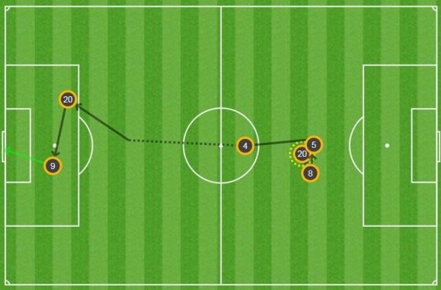 如图在上半场巴萨两次威胁的射门机会都来自保利尼奥。第一球则是他纵向跑位的射门,第二球则是他换位到中锋位置抢下来的头球。
