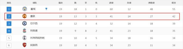半程战罢,曼联19轮录得13胜3平3负的成绩,拿下42个积分,排名积分榜第二,落后领头羊曼城13分,领先第三名切尔西3分;进41球,与利物浦并列英超第二;失14球,仅比曼城更多;27个净胜球也居全联盟次席。其实开局阶段,红魔一度与蓝月齐头并进,积分、进球数都不相上下,但爆冷输给升班马哈德斯菲尔德成为转折点,此后两队分差越拉越大,穆里尼奥的球队逐渐被死敌甩开,虽排第二但落后13分,这是英格兰顶级联赛历史上圣诞节前前两名的最大分差。
