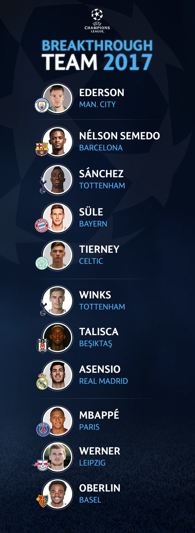 欧足联官方还分别点评了入围欧冠进步最快阵容的十一位新人: