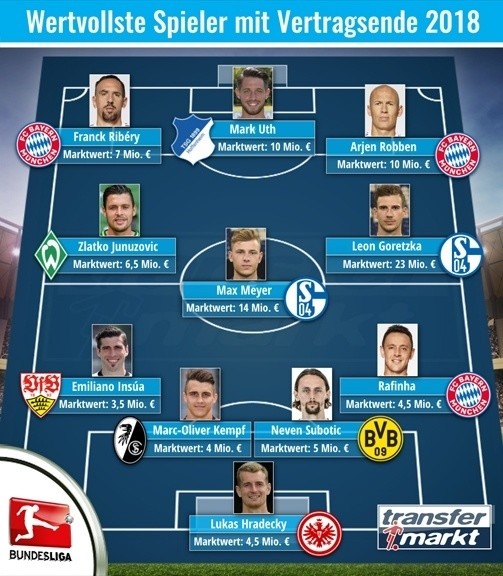 腾讯体育讯 北京时间12月26日,从1月1日开始,与现俱乐部合同在2018年夏天到期的球员,就可以自由和其他俱乐部谈判、预签合同了。德甲合同即将到期的球星中,不乏罗本、里贝里这样的大腕儿,也有戈雷茨卡、马克斯-迈尔这样的希望之星。