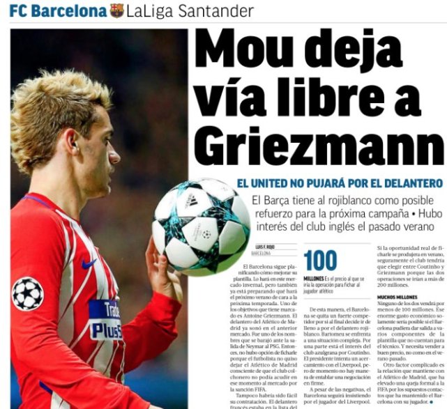 曼联对于格列兹曼的兴趣由来已久,早在今年夏天,曼联就试图引进法国人,当时英超豪门备下了1亿欧元的转会费,甚至准备了7号球衣,原本格列兹曼也计划来到曼联和国家队队友博格巴合作。但是马竞关于转会禁令的上诉遭到FIFA驳回后,格列兹曼出于对于马竞的感情留在了床单军团。
