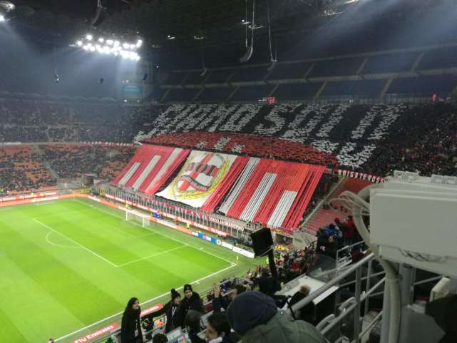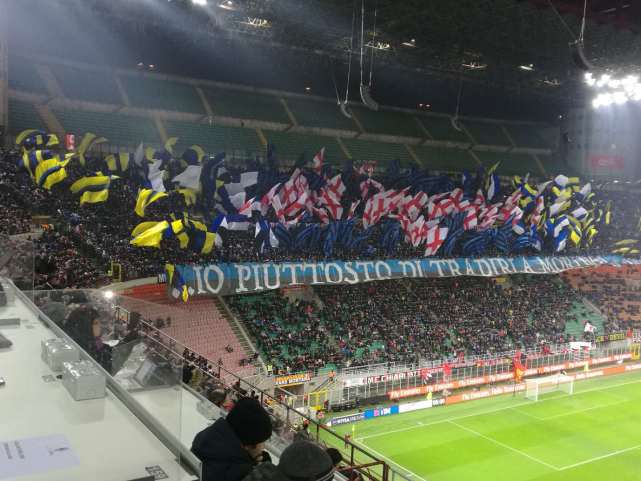 是德比就会有tifo之间的对抗,这是惯例,比赛开始前一小时,米兰南看台早早支起了两侧的帷幔,一看就是大阵仗,国米北看台则悄无声息,待双方球员出场,答案揭晓:米兰这边是大写的“SIAMO SOLO NOI”(只有我们),配合“米兰城只有我们”的歌词,颇有气势;而国米这边则是祭出战旗林,搭配横幅“与其背叛球队,我不如去死”,简单而直接。原谅两边死忠看台缺乏诗情画意,从确定意大利杯米兰双雄对决到正式比赛短短一周时间,他们来不及准备。