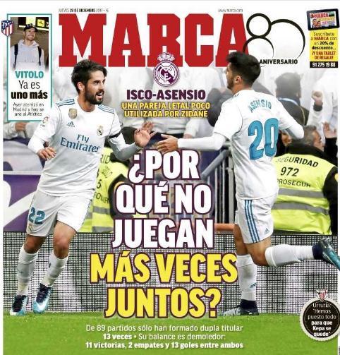 齐达内这种无视队内最强武器组合的方式也引发了《马卡报》的吐槽,该报给出的大标题是:“为什么阿森西奥与伊斯科不能一起踢球呢?”或许在下半赛季,齐达内应该考虑伊斯科与阿森西奥的这一组合了。