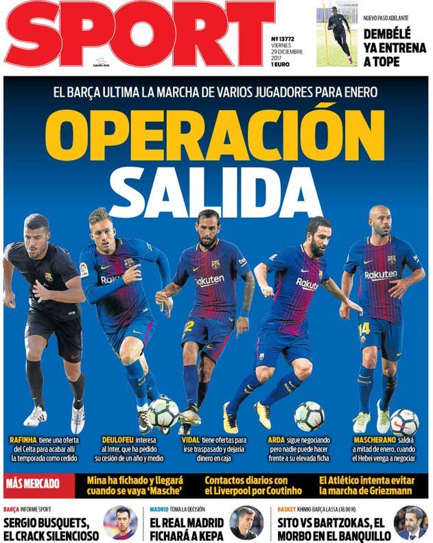 《每日体育报》则在封面指出,巴萨很可能在1月份进行人员清洗,除了马斯切拉诺将前往中国踢球外,另外的四名球员拉菲尼亚、图兰、比达尔、德乌洛费乌也进入了清洗名单。这四人里,拉菲尼亚接到了塞尔塔的邀请,为了世界杯梦想,这名巴西球星可能选择离开诺坎普。德乌洛费乌受到了国际米兰的关注,他可能重返意甲踢球。至于图兰,巴萨清洗他的难度比较大,因为他的工资比较高,比达尔则也有报价送达。