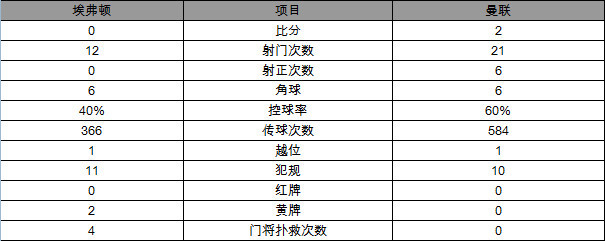全场比赛,曼联21次攻门6次射正打入两球,埃弗顿12次攻门全部射偏没有入球。曼联控球率达到60%,埃弗顿则为40%。
